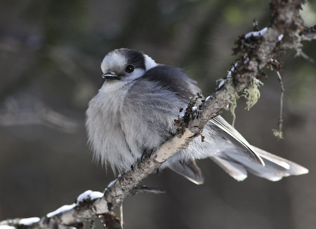 A Grey Jay. These birds are quite friendly, in fact some would say over-friendly! This one is all puffed up against the cold.